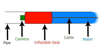 As you can see in the diagram below. An inflatable balloon is inserted into the pipe and inflated creating a sealed section of the pipe. A camera is used to ensure that the seal is true and no water is leaking through. Then this section of the pipe is filled with water to see if there are any leaks. Through this process a leak can be pin pointed quite accurately.